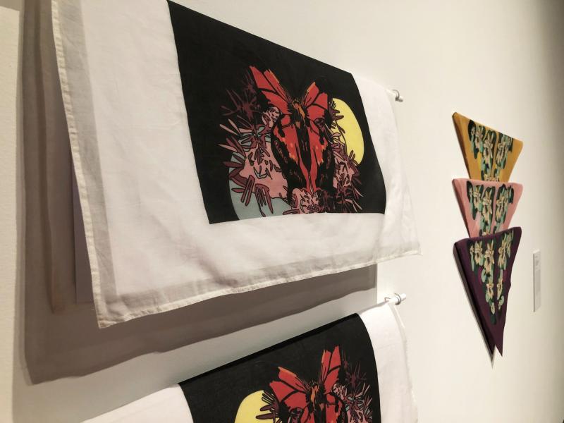 The first of these is Fallon Simard’s Gidaanji'idizomin; Gibimaadizimin debwewining (We are changing ourselves; We are living in the truth), an edition of 150 printed organic cotton bandanas that are among the first objects seen when entering the Main Gallery. Simard created the design for these scarves in response to Mike MacDonald’s medicine and butterfly gardens and, in the spirit of reciprocity and sharing, is offering them to Gallery visitors as a free takeaway for as long as supplies last.