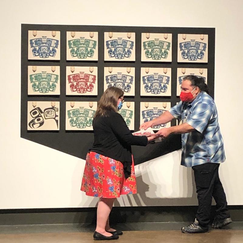 4. Luke Parnell hands a print from Laxgiik Convocation Robe to a visitor during the Opening Reception of Powerful Glow. Photo: KWAG.